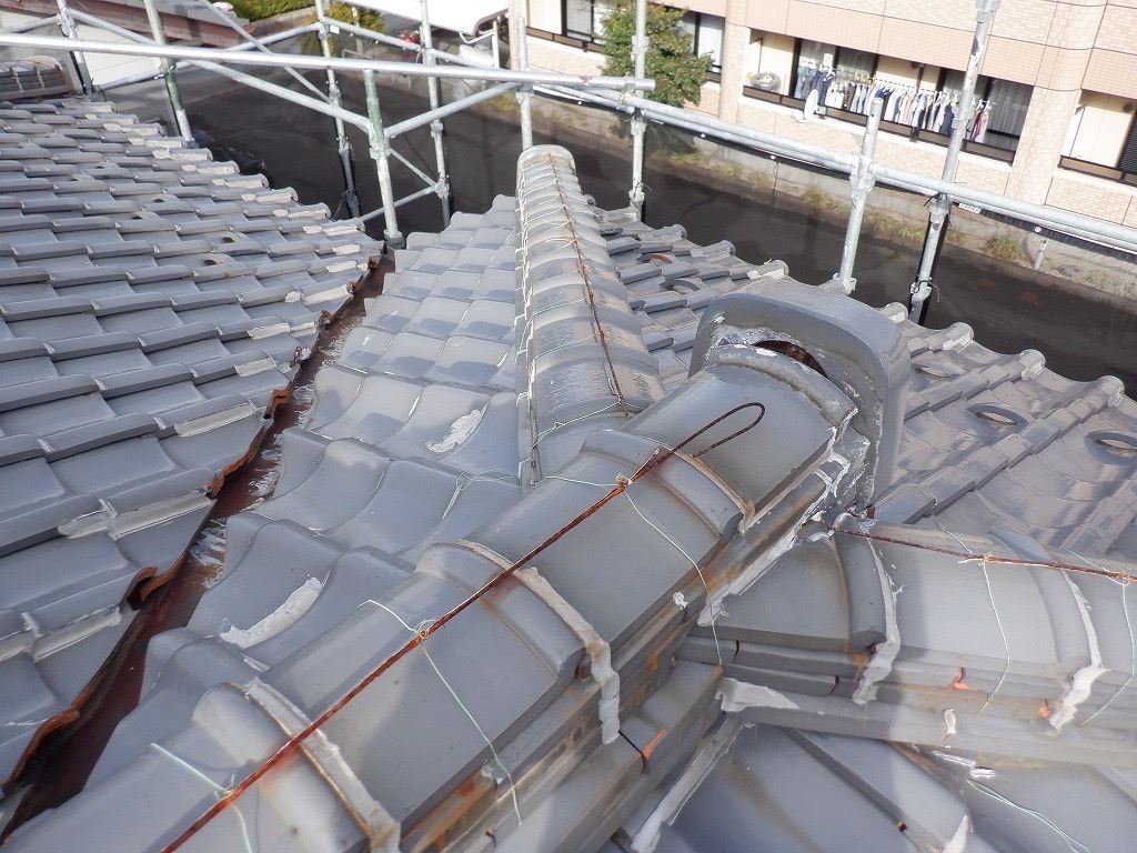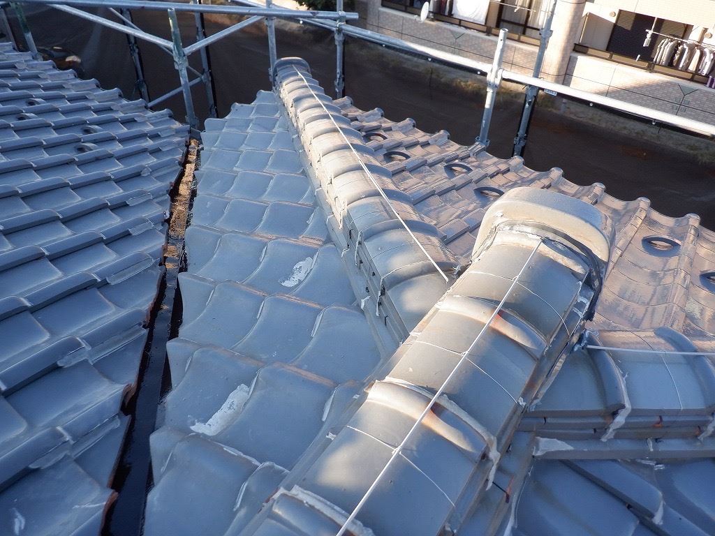 足場工事/瓦漆喰工事/棟バンセン交換工事/鬼瓦シーリング工事/谷板金塗装工事を行わせていただきました。